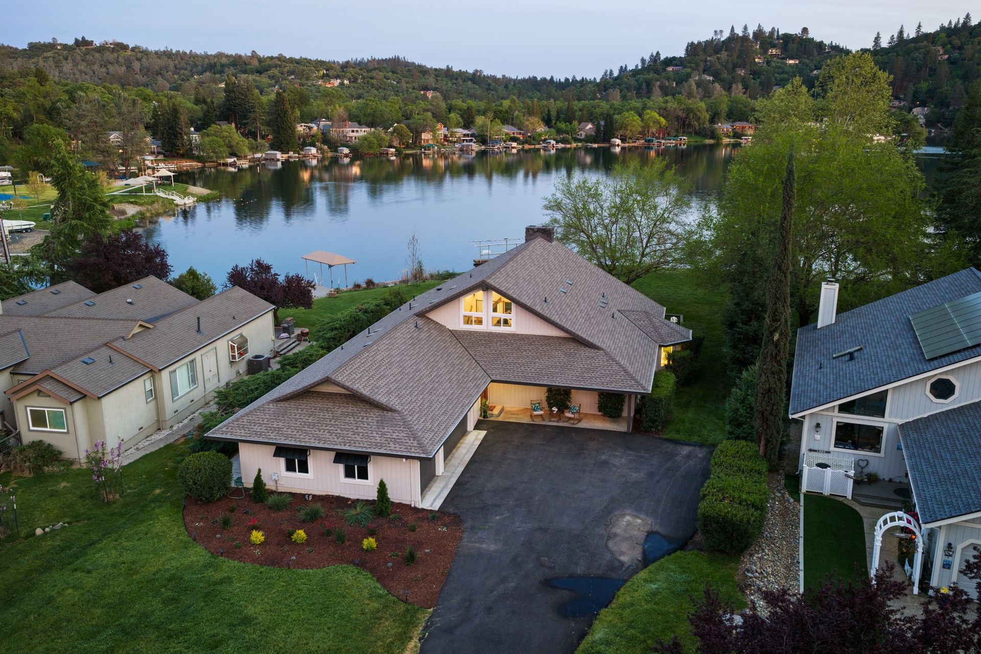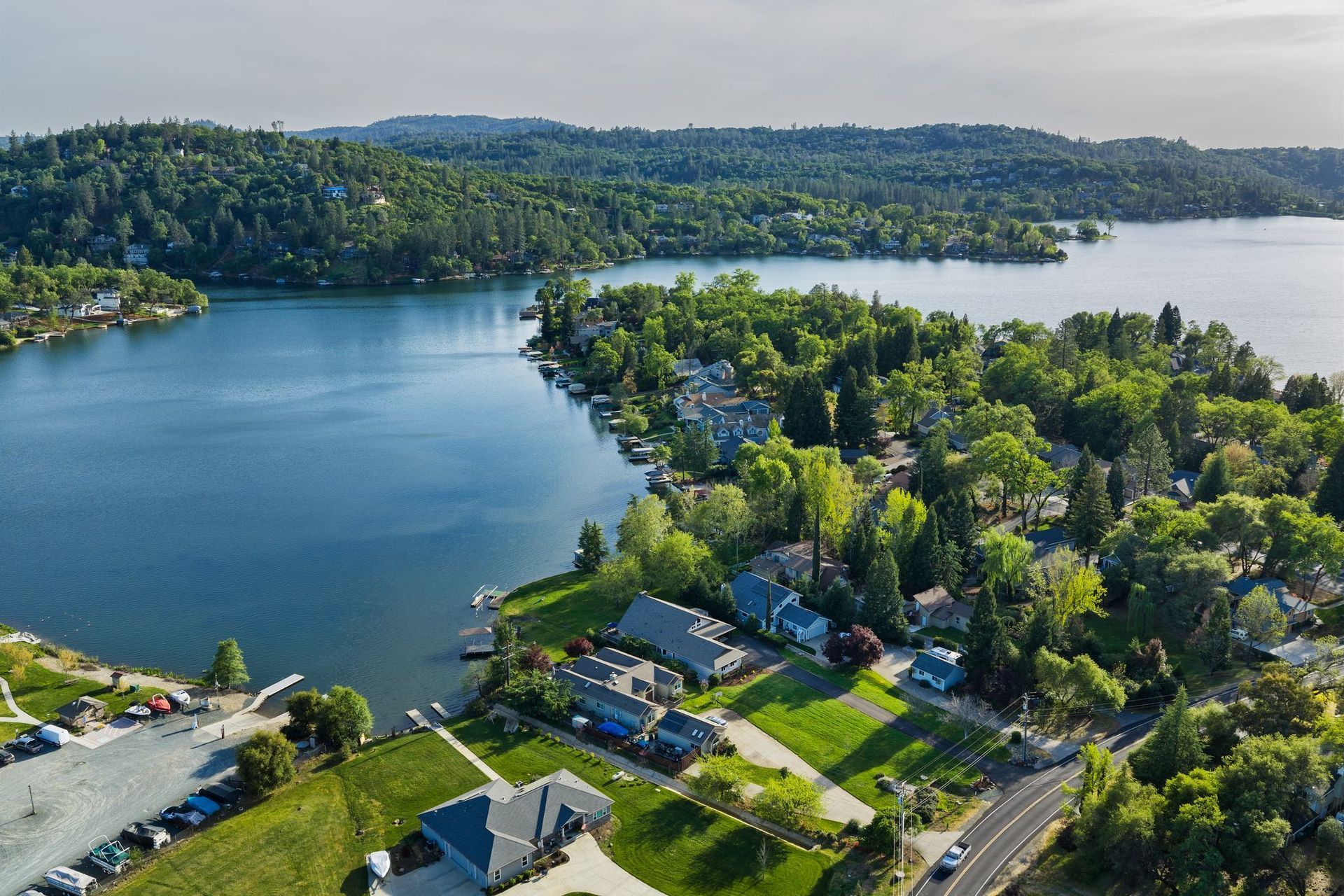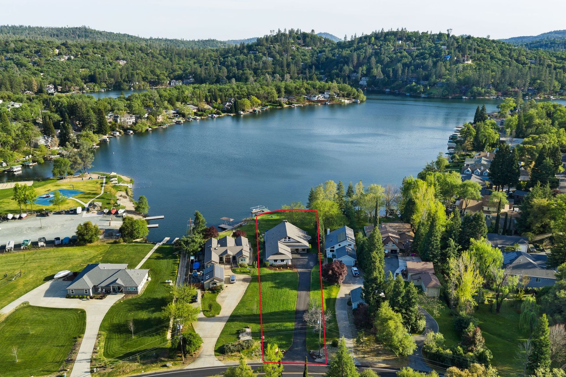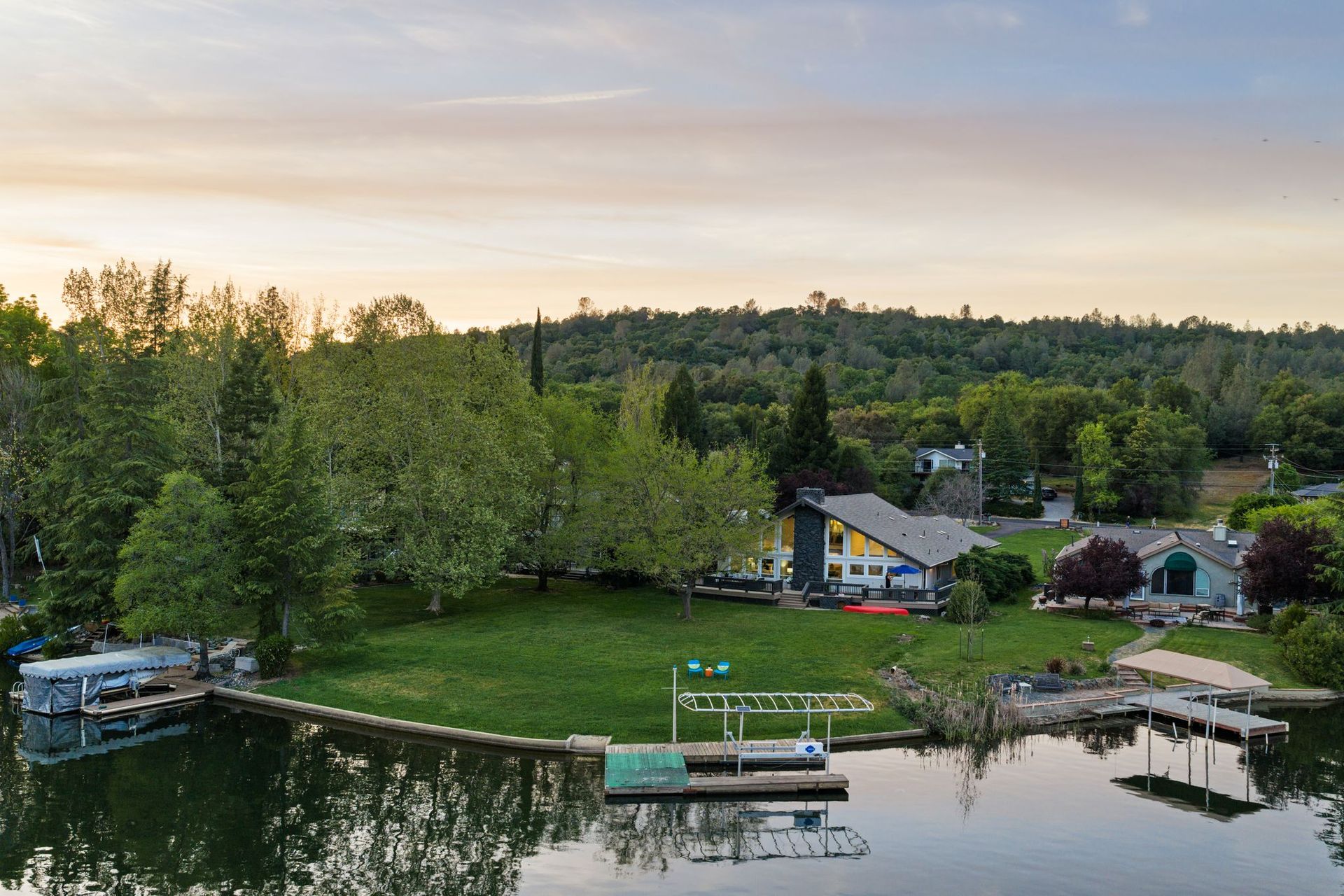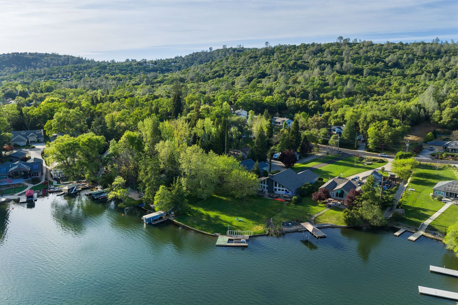 A private dock, equipped with a brand-new lift, awaits whatever vessel calls this water home. The half-acre lot is entirely level — an exceptional rarity in the Sierra Nevada foothills — providing abundant, usable outdoor space from the front motor court all the way to the water's edge.