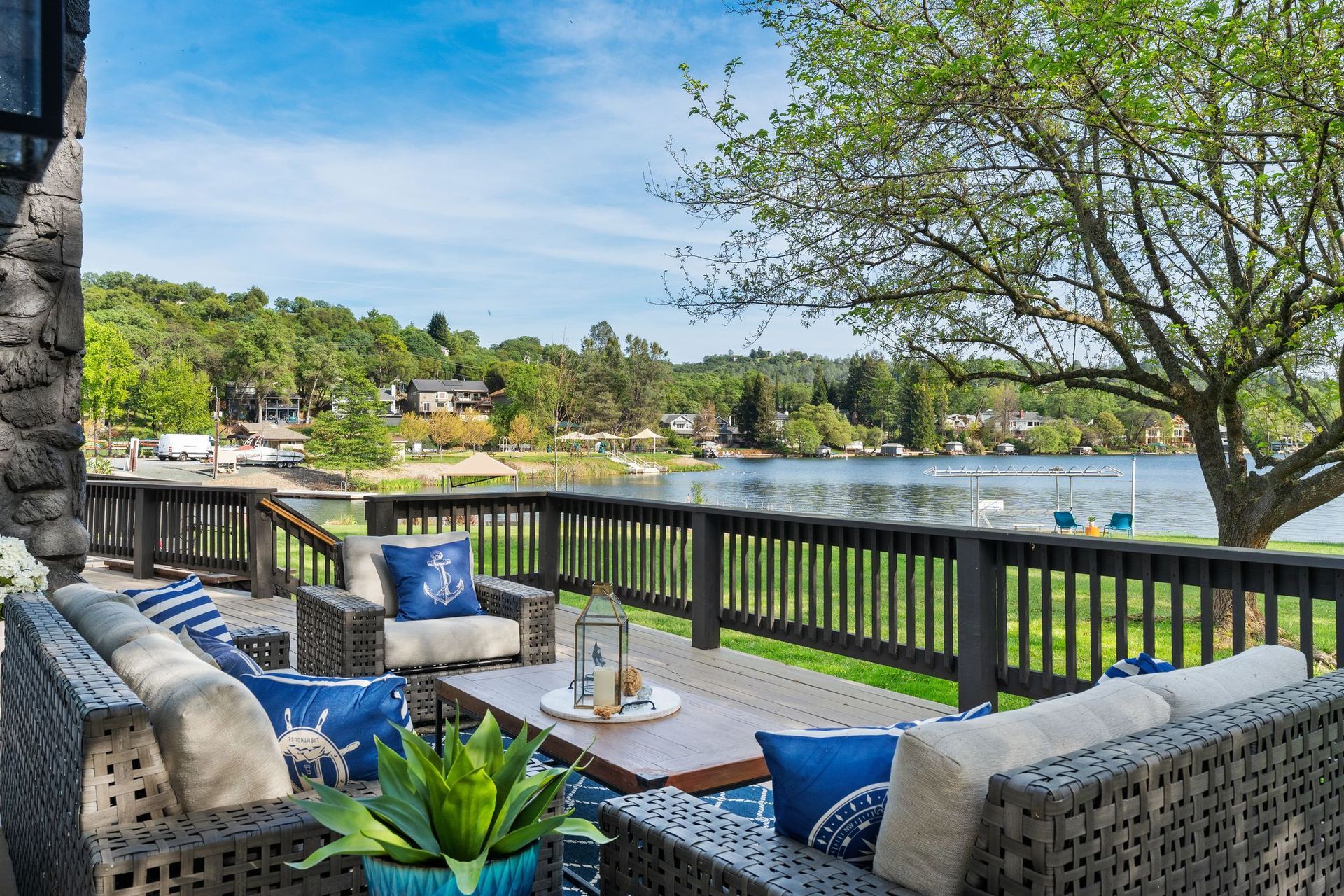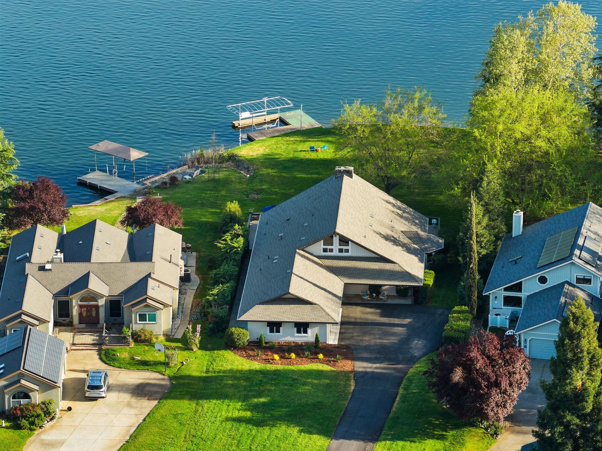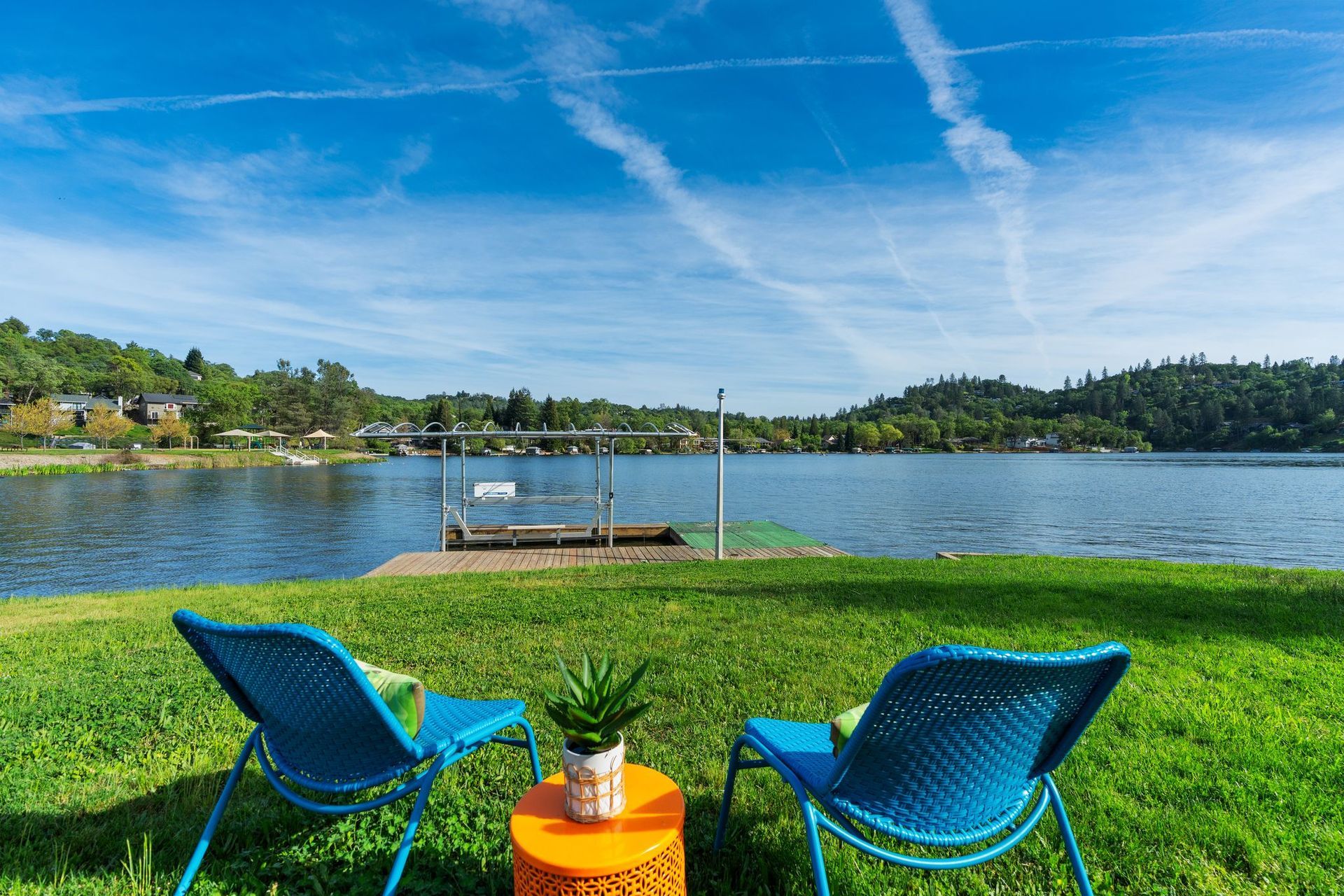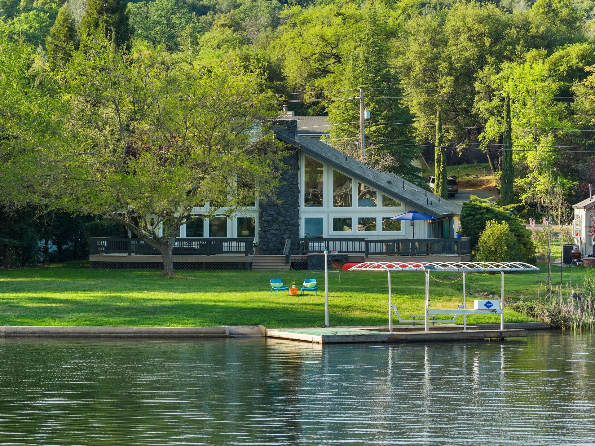 A private dock, equipped with a brand-new lift, awaits whatever vessel calls this water home. The half-acre lot is entirely level — an exceptional rarity in the Sierra Nevada foothills — providing abundant, usable outdoor space from the front motor court all the way to the water's edge.