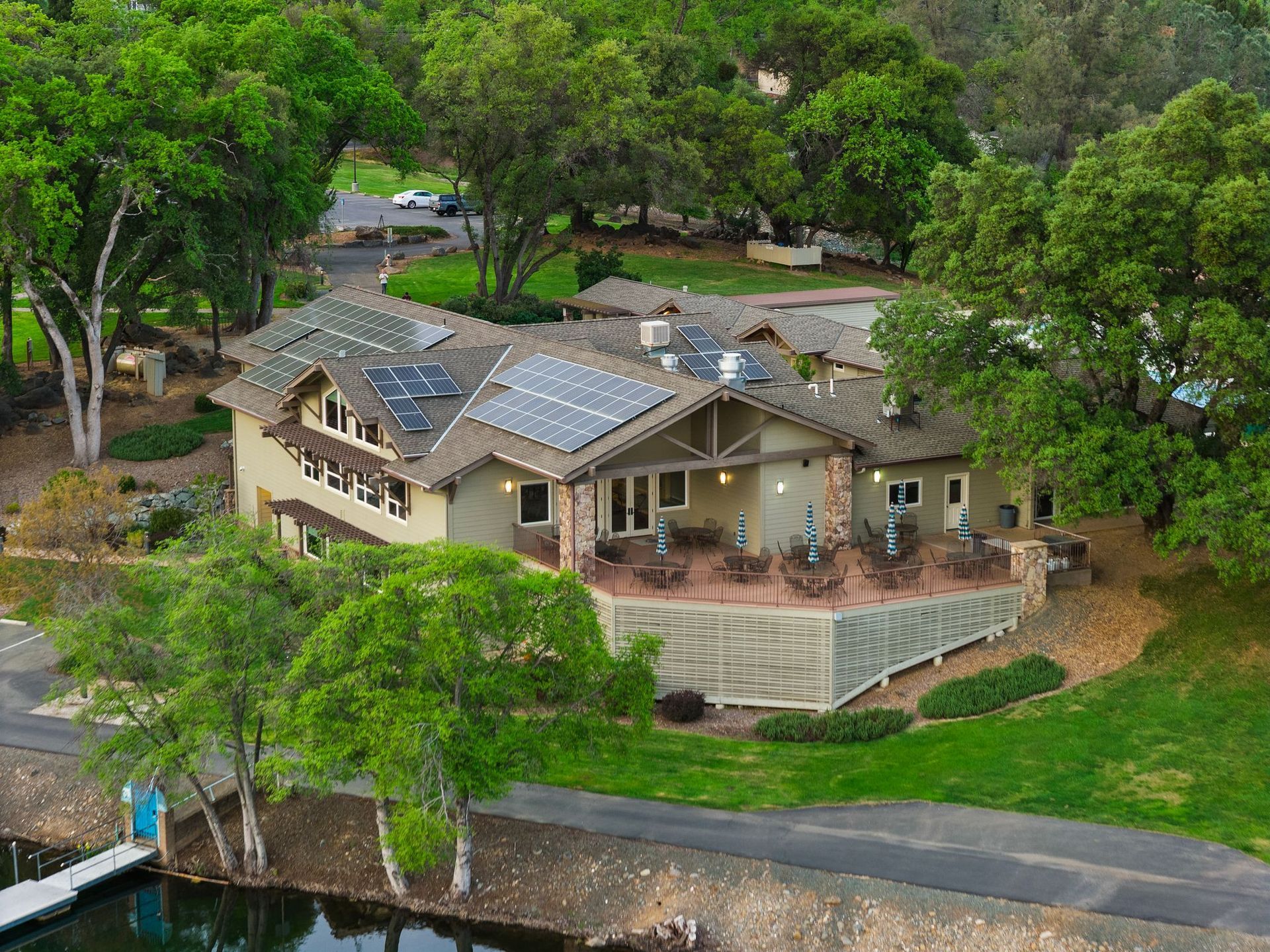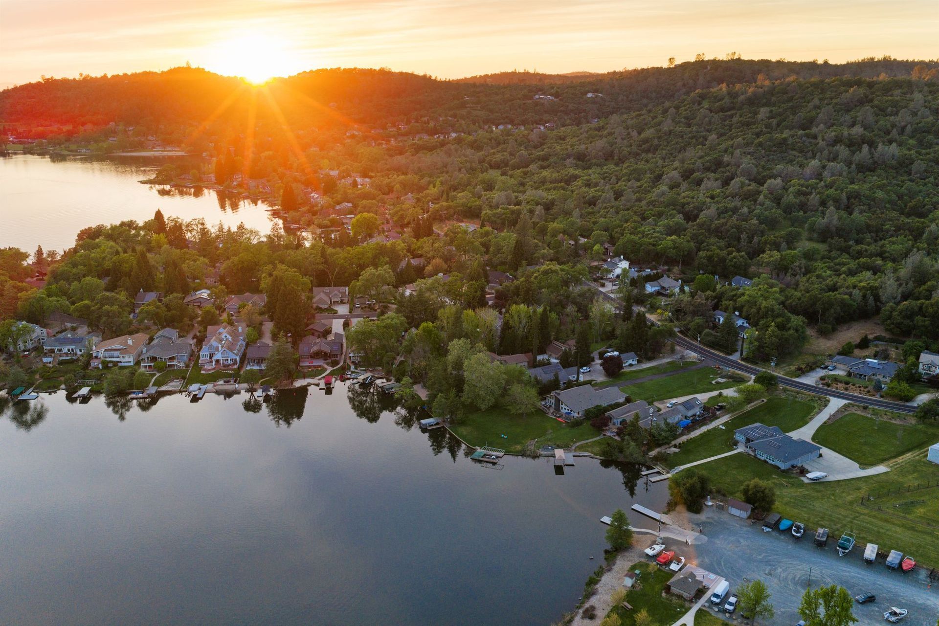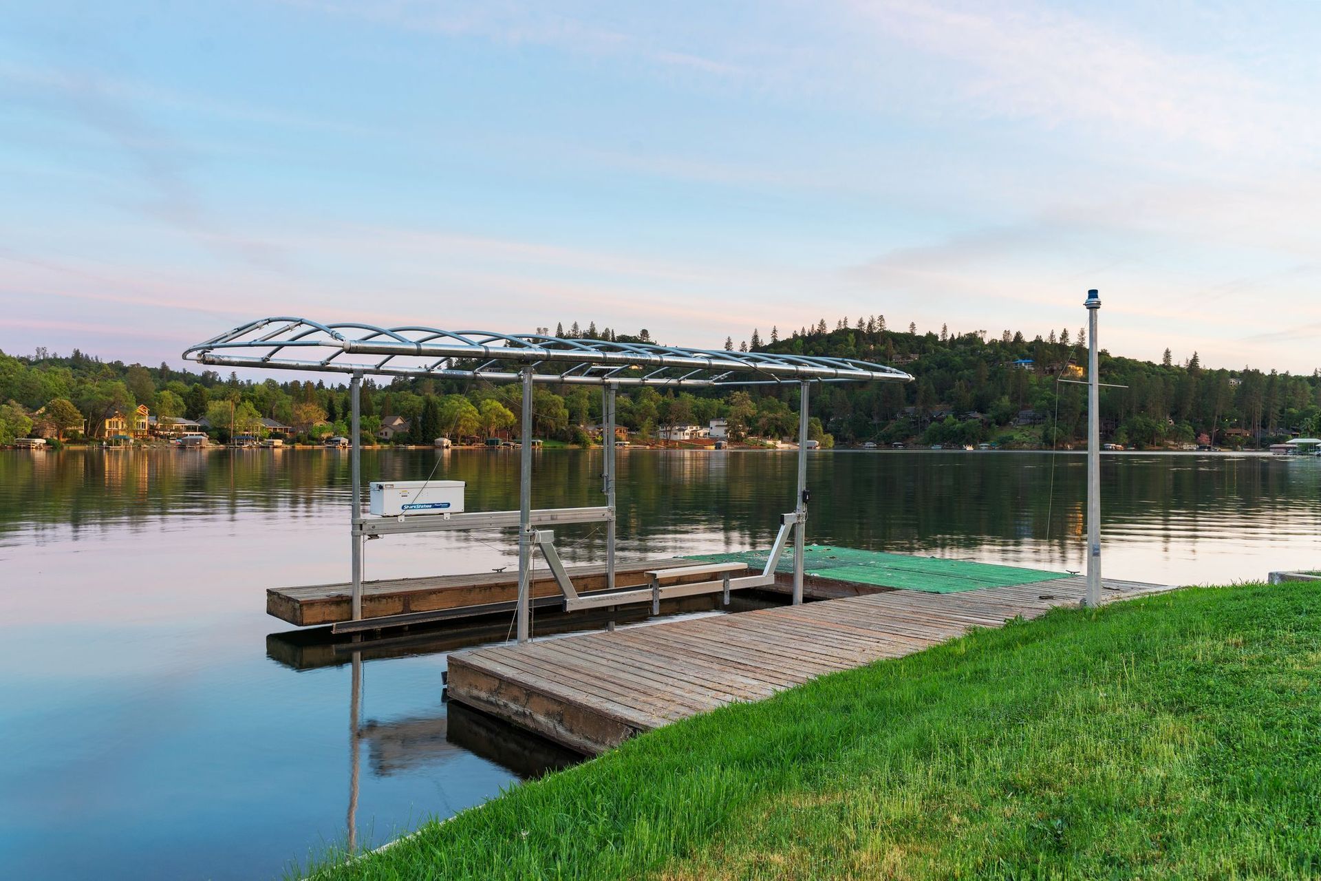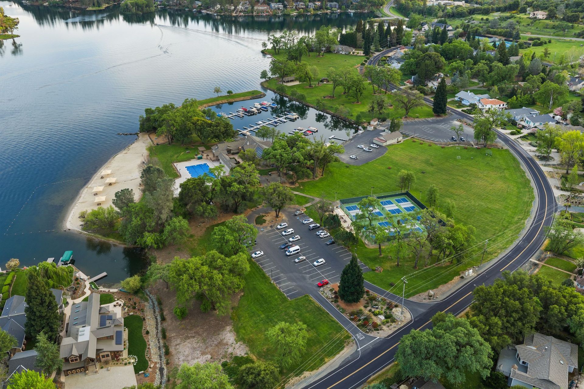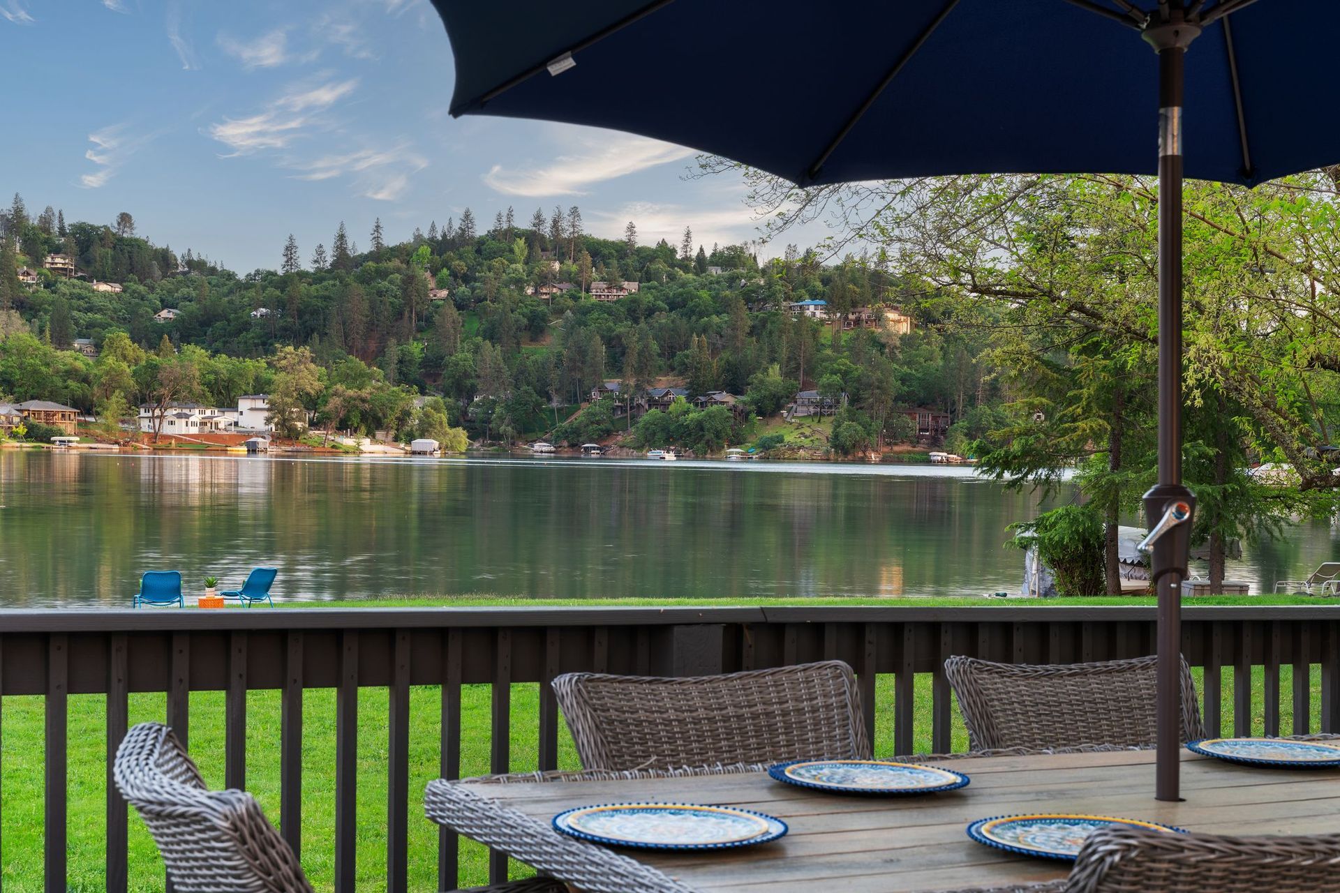 A private dock, equipped with a brand-new lift, awaits whatever vessel calls this water home. The half-acre lot is entirely level — an exceptional rarity in the Sierra Nevada foothills — providing abundant, usable outdoor space from the front motor court all the way to the water's edge.