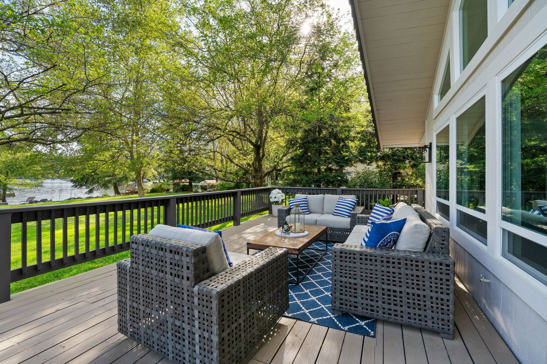 The expansive back deck extends the living space outward, serving equally well for private morning coffee or gathered lakeside entertaining. Steps lead directly to your own 130 feet of shoreline — an extraordinary span for a community this sought-after.